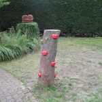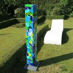 2018Louk’s Tuintotems van kunsthars zijn gelamineerd met glasvezel, afgewerkt met acrylverf, sealer en lak en dus uv- en weerbestendig. Er zijn totaal 3 unieke exemplaren gemaakt die verschillen in hoogte en decoratie. De totems staan op een rvs-pin in de grond. De getoonde versie meet (zonder pin) 125 x 18 x 18 cm