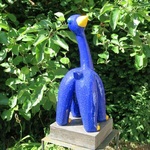 2013Dino kijkt verwonderd om zich heen. Hij staat op een hardstenen sokkeltje in de tuin en ziet alles. Is een beetje bleu type, stevig geaard, staartje omhoog. Gemaakt van geëxpandeerd schuim en gelamineerd met glasvezel en kunsthars zodat hij buiten kan blijven staan, gedecoreerd met uv-bestandige acrylverf, afgewerkt met lak en sealer. Unicaat Afm 20 x 20 x 50 cm.. Totaal 2 kg.