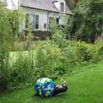 2013Tuinslak voor buiten Dit is een slak. Een slak hoort in de tuin. Gebeeldhouwd in schuim, opgebouwd en gelamineerd in kunsthars. Kleurrijk gedecoreerd in uv-bestendige acryl-verven, afgewerkt met polyurethaan lak en sealer, zeer geschikt voor buiten. Gesigneerd en gedateerd voor de kunstenaar. Unicaat. Afm. 83 x 35 x 46 cm. Waait niet weg: gewicht 15 kg.